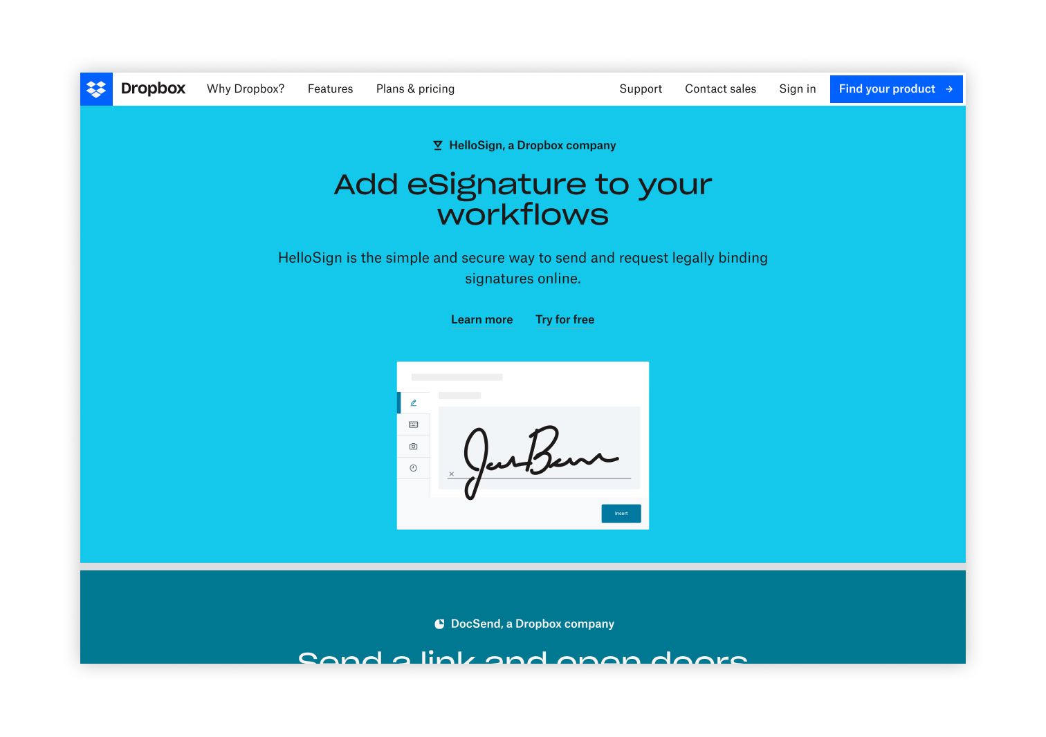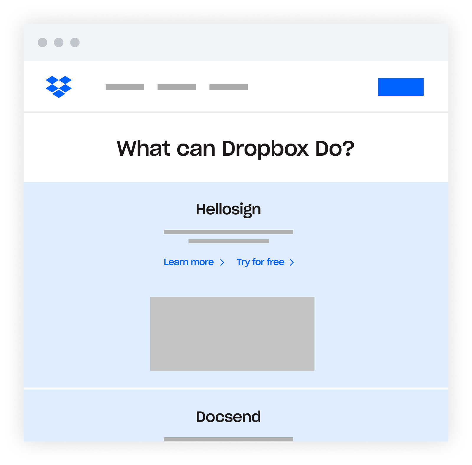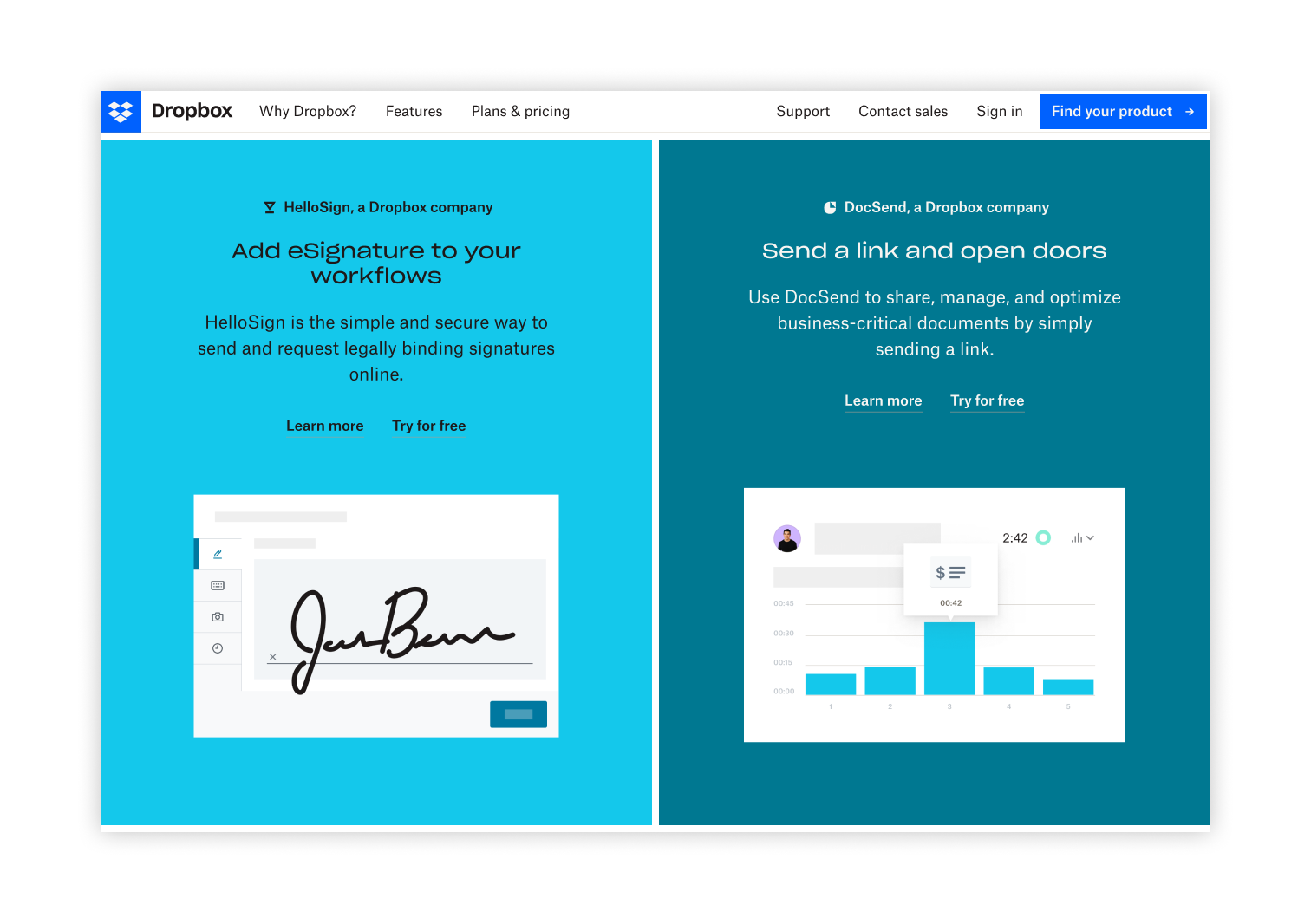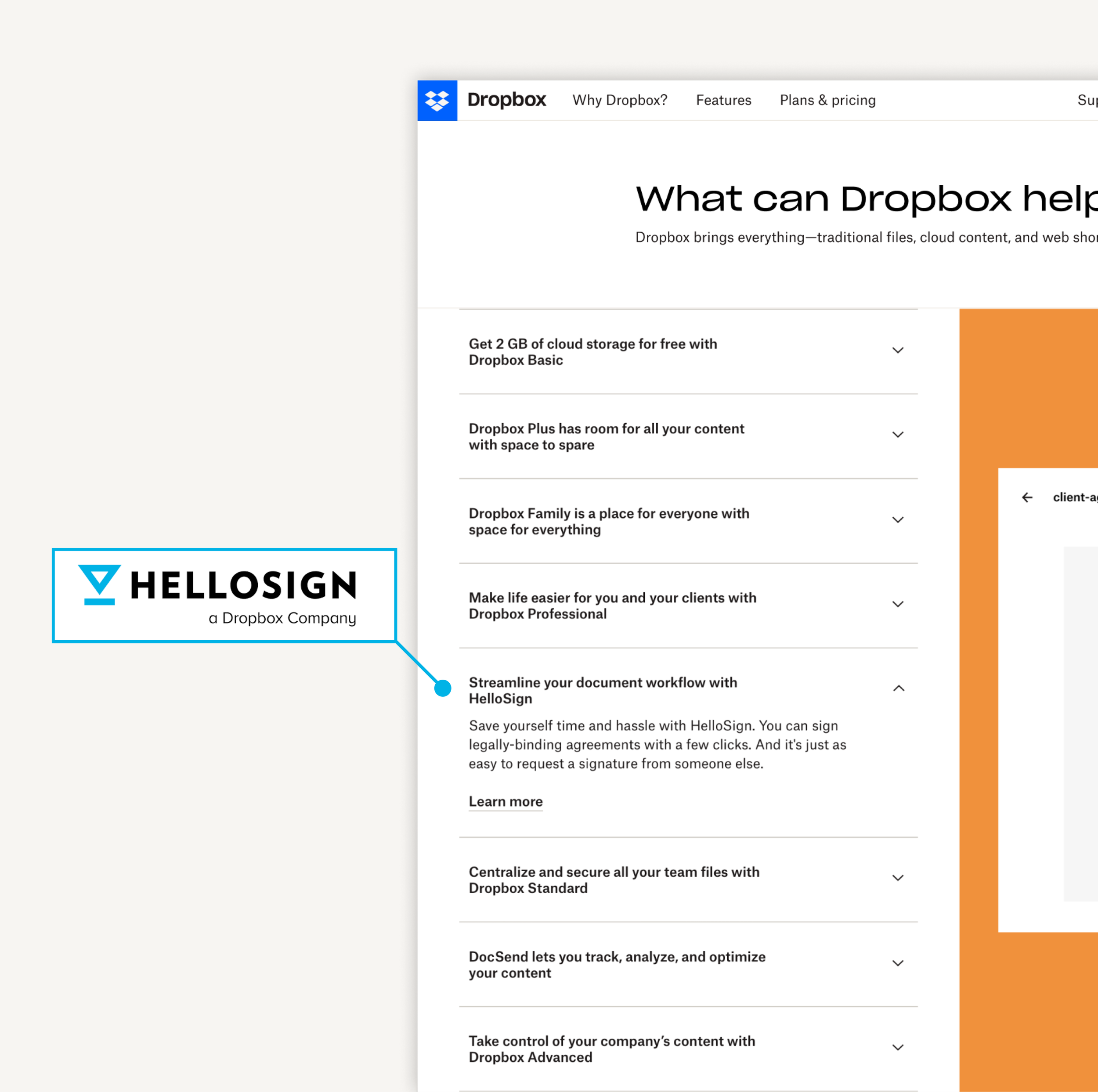 Dropbox has many new product offerings including HelloSign & DocSend that are displayed in an accordion user interface.