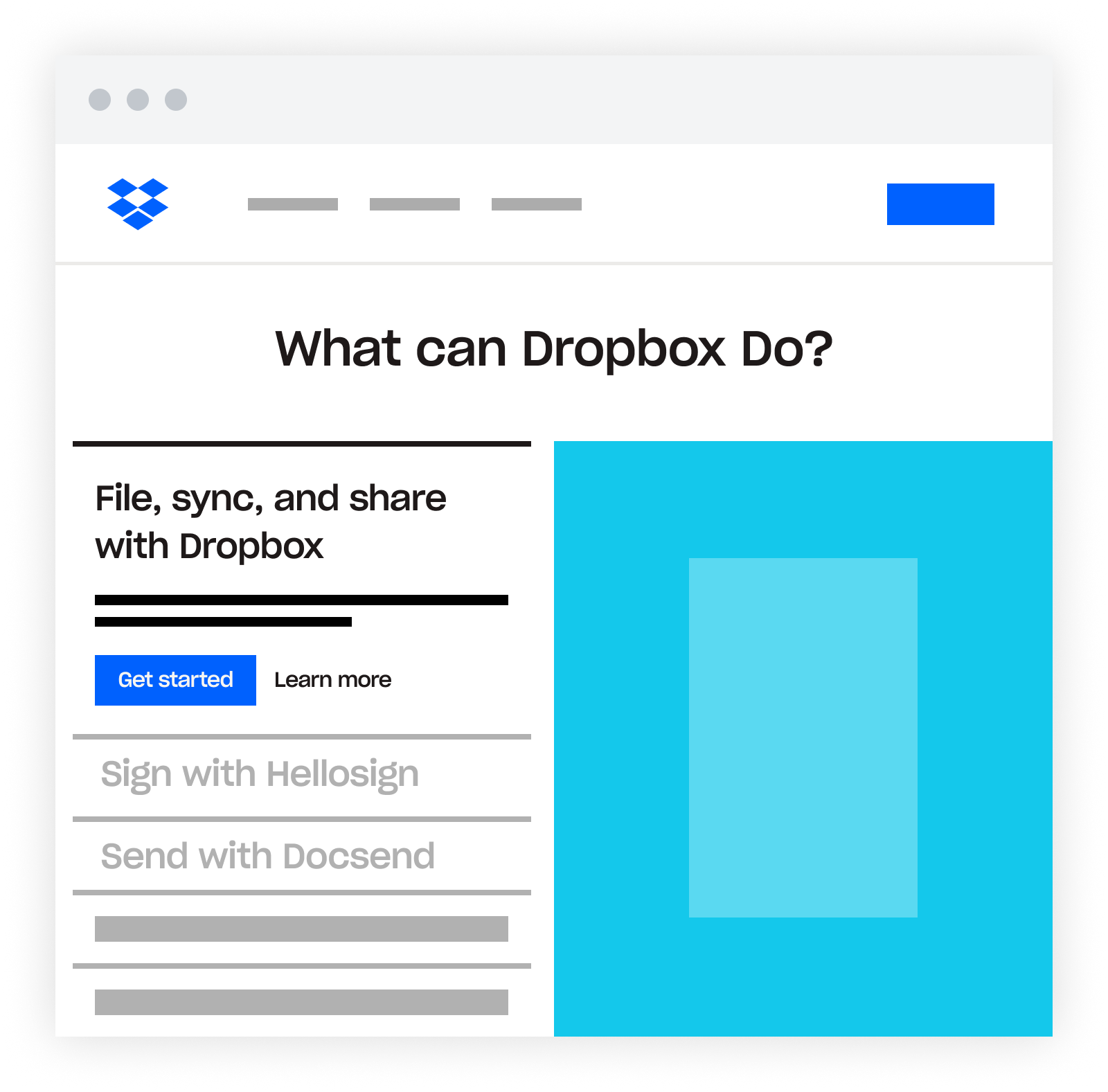 When a visitor first arrives at Dropbox.com, they will see the welcome message and scroll down to discover the Product Tiles. Once they have chosen a product to engage with, they will have the opportunity learn more about plans and choose one to checkout with.
